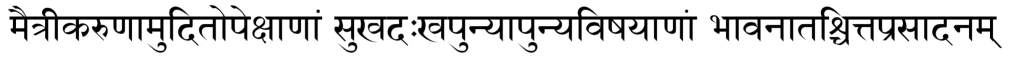 maitrī-karuṇā-muditopekṣāṇāṃ sukha-duḥkha-puṇyāpuṇya-viṣayāṇāṃ bhāvanātaś citta-prasādanaṃ